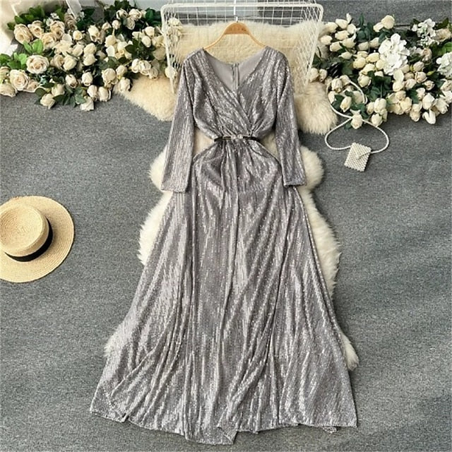 Dresses Type: Sequin Dress, Fabric: Polyester, Gender: Women's, Design: Sequins, Occasion: Beach, Outdoor, Evening Party, Party, Daily, Going out, Style: Fashion, Modern, Elegant, Fit Type: Regular Fit, Dress Length Type: Midi Dress, Neckline: V Neck, Sleeve Length: Long Sleeve, Elasticity: Micro-elastic, Look After Me: Hand wash, Machine wash, Pattern: Plain, Season: Autumn, Spring,