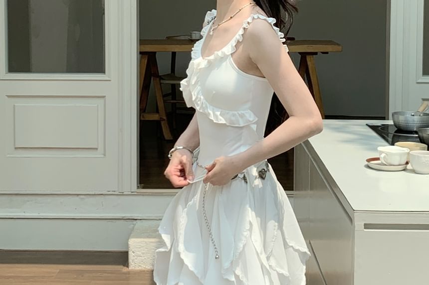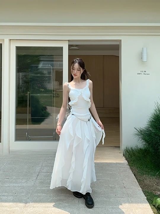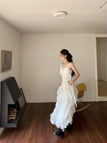 Plain Ruffle Trim Slim Fit Tank Top / Elastic Waist Asymmetrical Midi A-Line Skirt