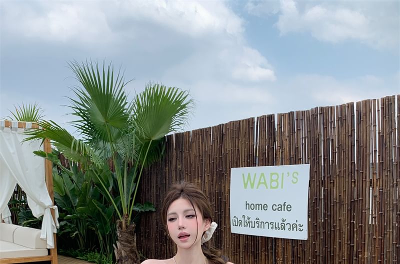 Plain Bow Tube Top / Drawstring Waist Plaid Mini A-Line Balloon Skirt