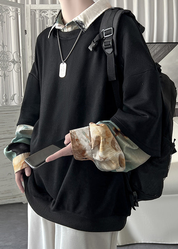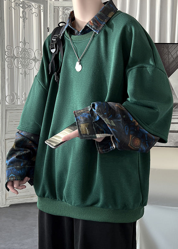 Loose Blackish Green Peter Pan Collar Patchwork False Two Pieces Cotton Mens Sweatshirts Spring