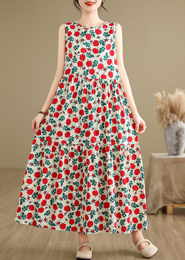 Bohemian Beige O Neck Print Cotton Long Dresses Sleeveless JH029