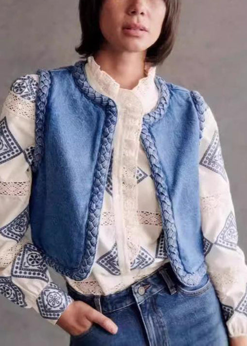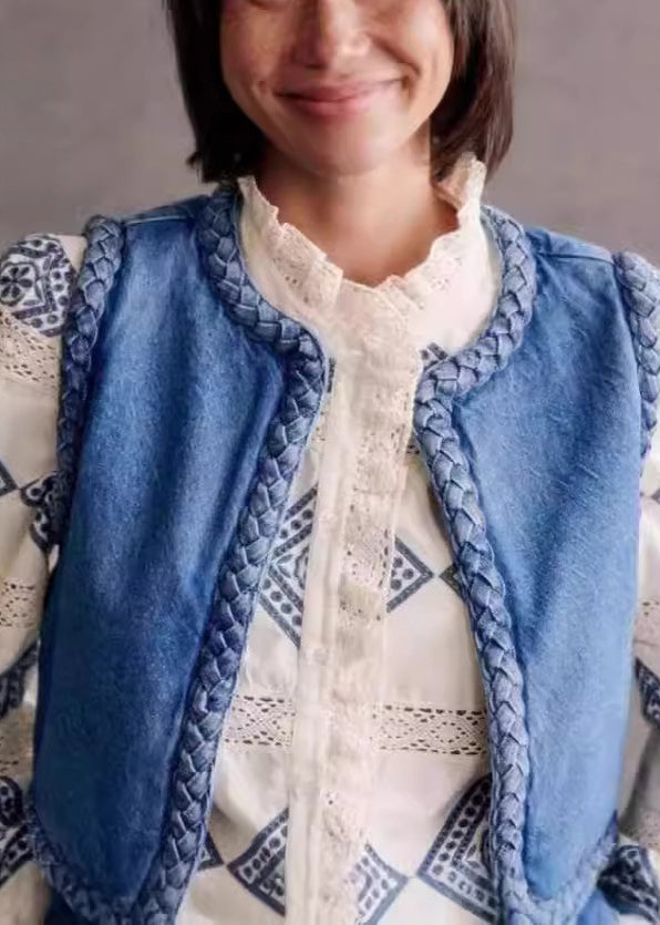 Bohemian Filled Fine Cotton Vest Neck Blue Sleeveless Denim O