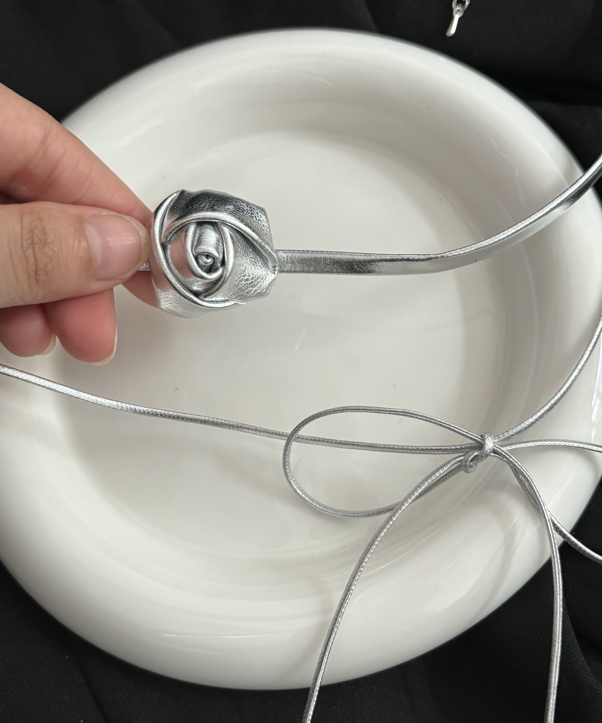 This elegant necklace features a combination of silk, leather, and a double-layered bow design with a delicate rose accent.