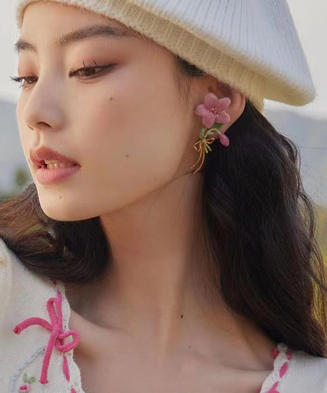 Cute Pink Sterling Silver Overgild Floral Drop Earrings PO074