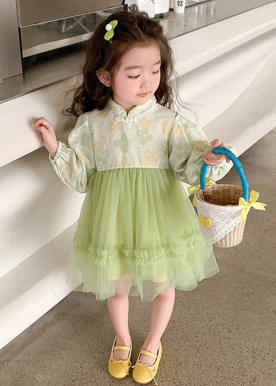 Elegant Green Stand Collar Tulle Patchwork Girls Dress Fall XZ093