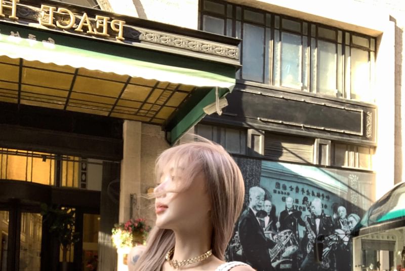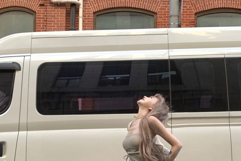 Flared Asymmetrical Pants Top High / Plain Waist Strapless Side-Slit Drawstring