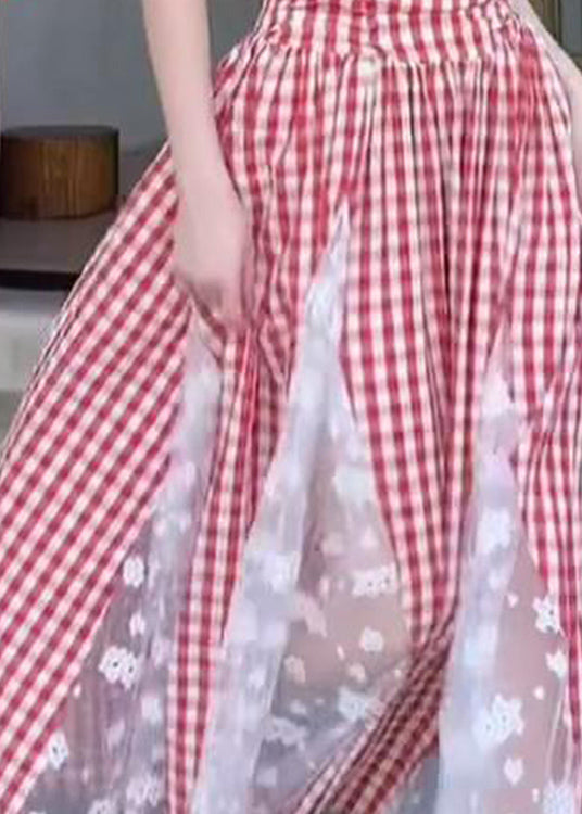 French Red Plaid Lace Patchwork Off The Shoulder Dress Summer