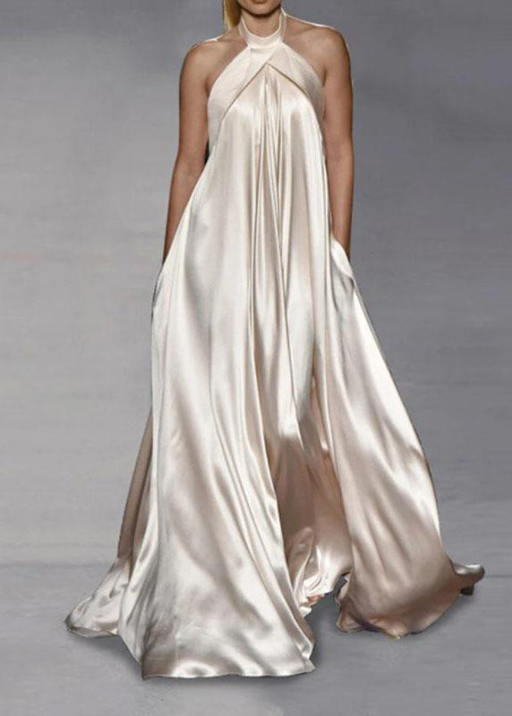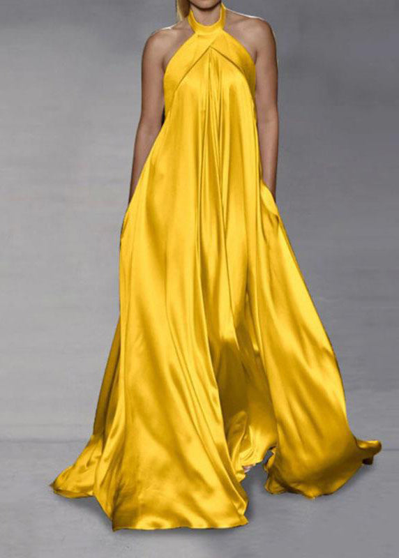 Experience luxurious elegance with our Italian Black Halter Patchwork Solid Silk Long Dress, perfect for the warm summer months.