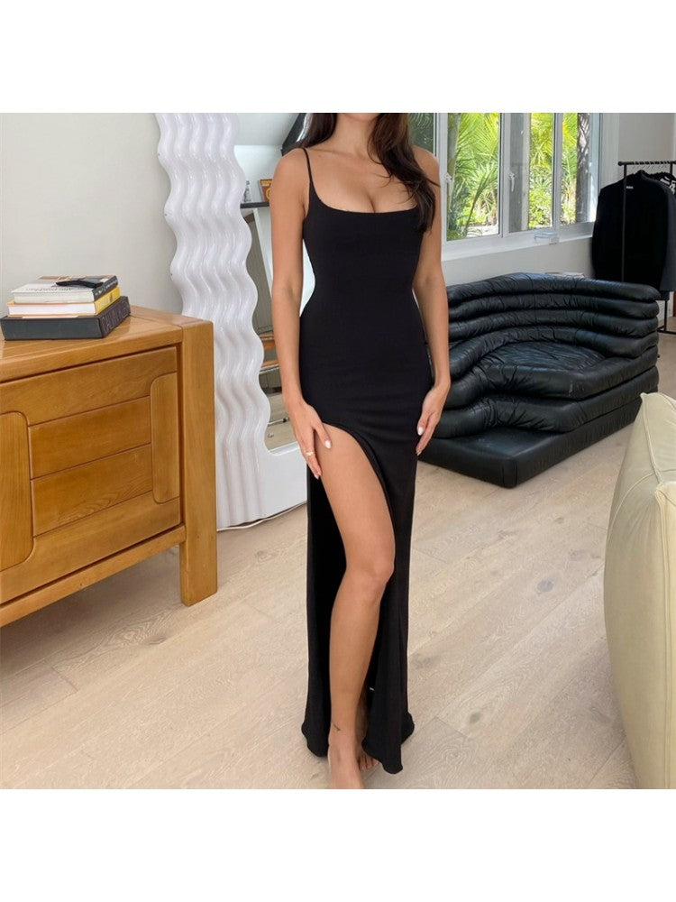 Lace Patchwork Black Slit Spaghetti Straps Maxi Dress