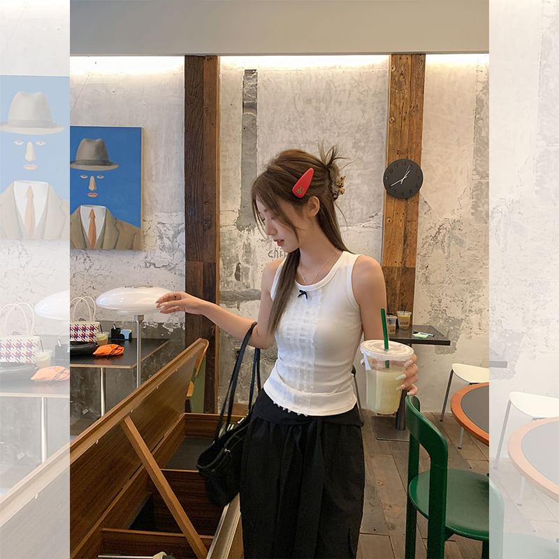 Crew Neck Bow Lace Panel Slim Fit Tank Top