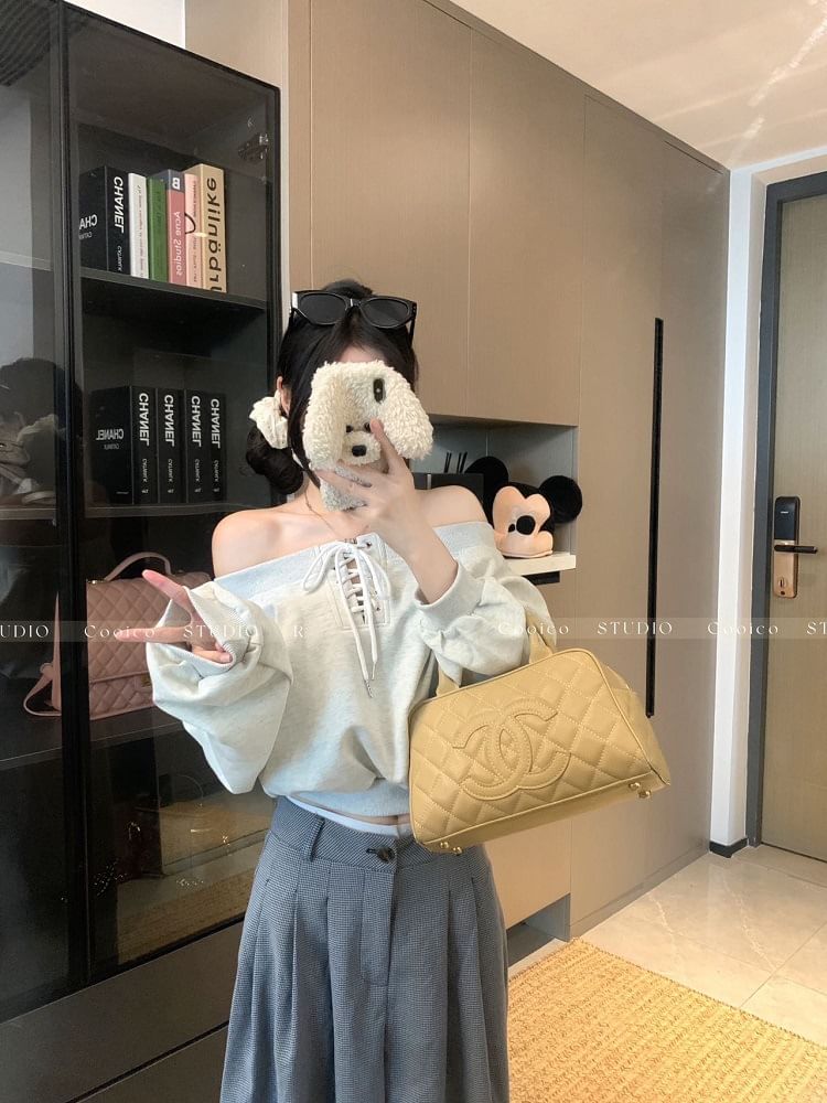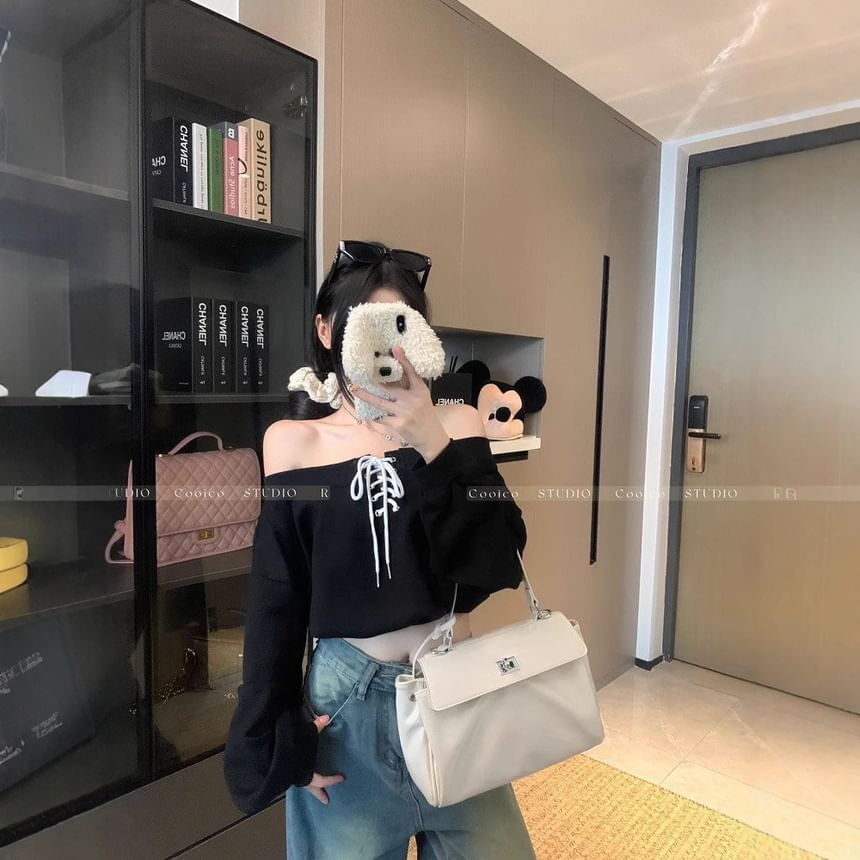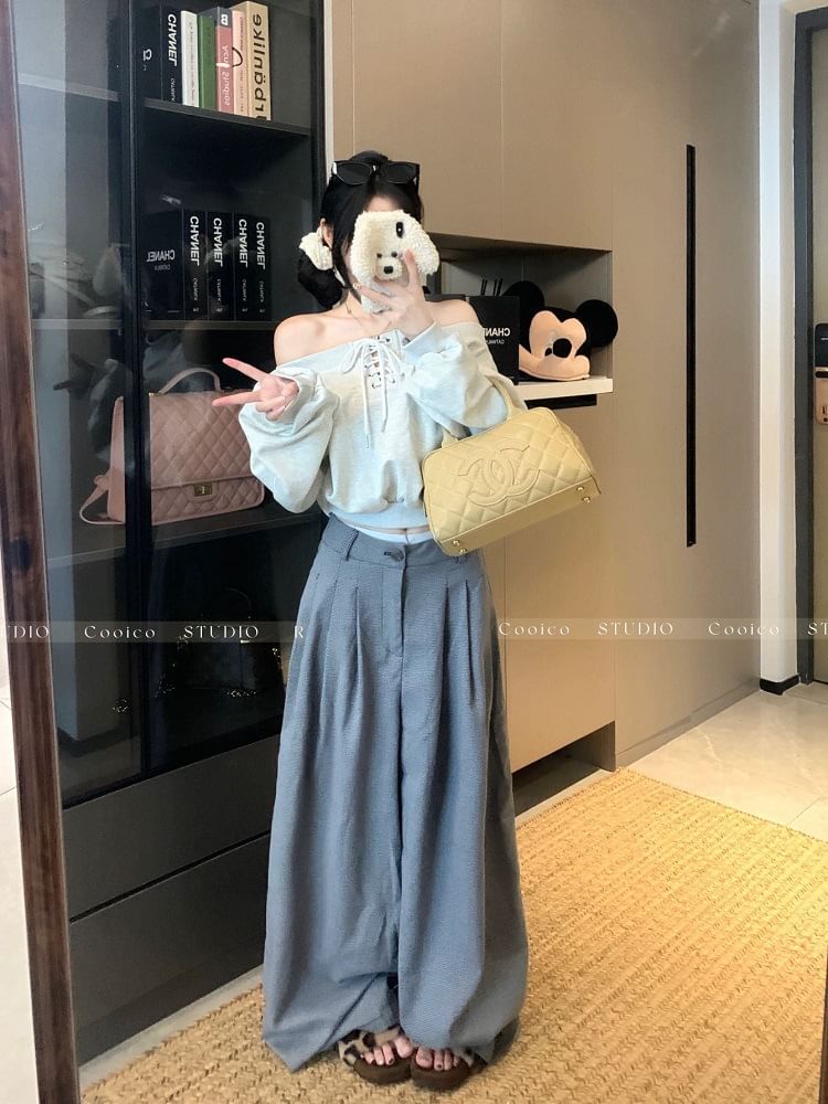 Long Sleeve Off Shoulder Plain Lace Up Sweatshirt