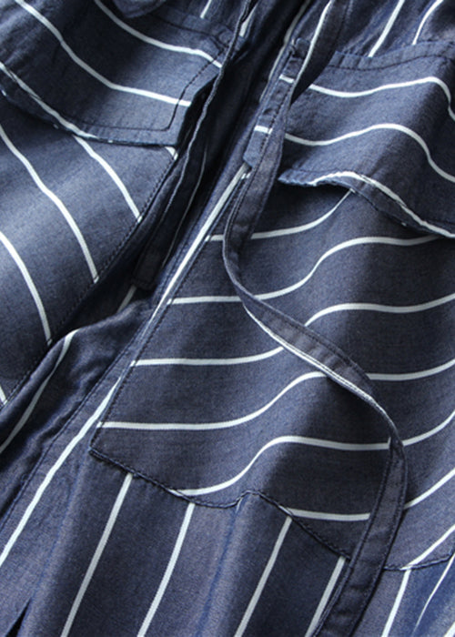 Loose Striped Button Lace Up Denim Blouses Dress Half Sleeve ZL049