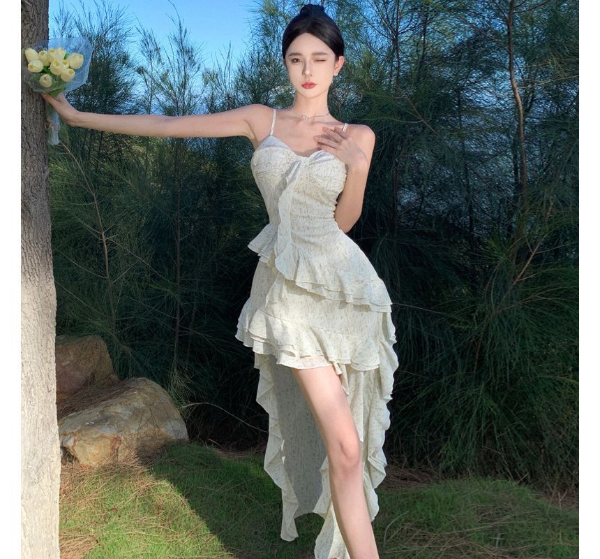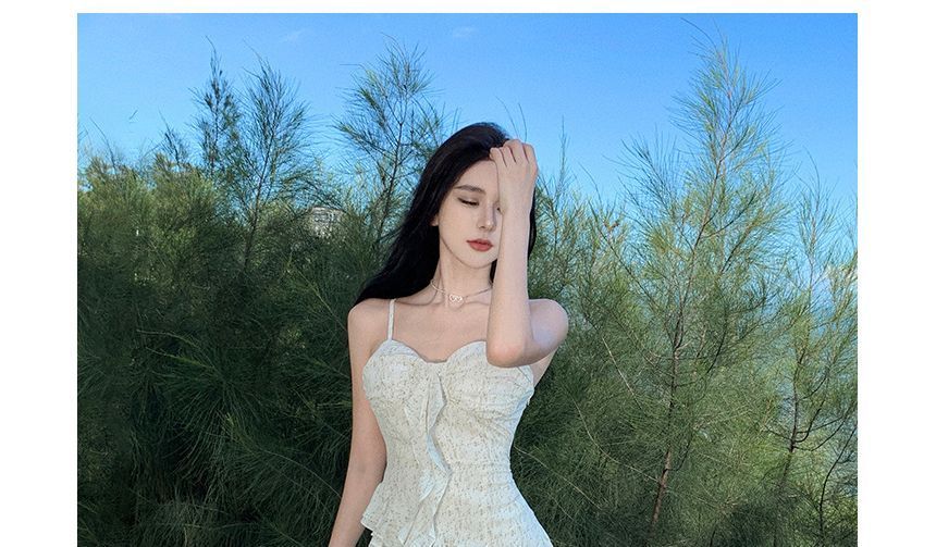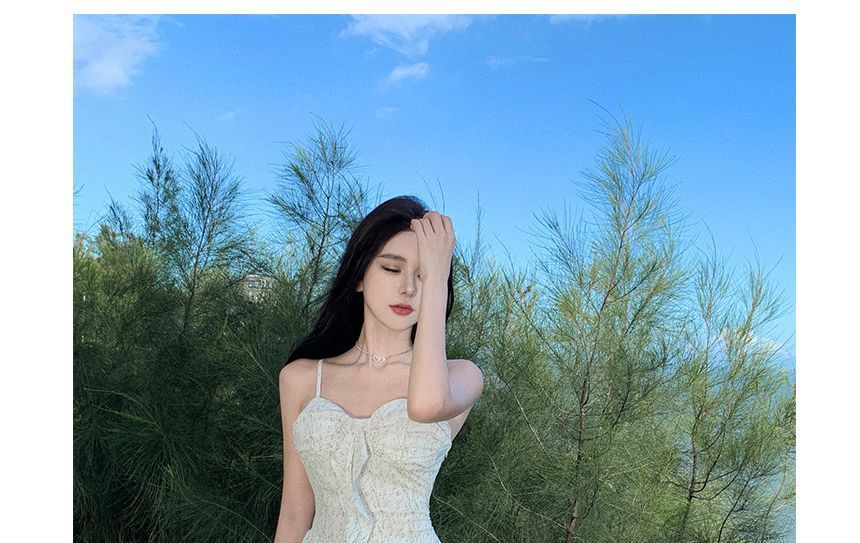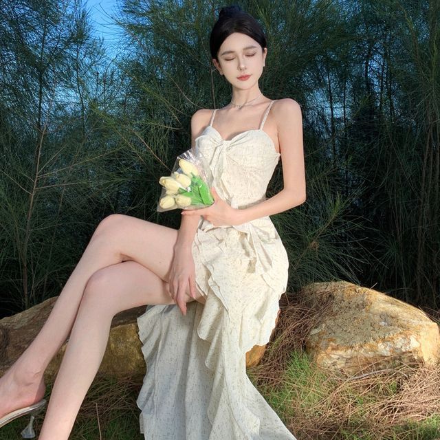 Maxi Floral A-Line Spaghetti Dress Ruffle Trim Strap