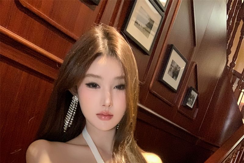 Halter-Neck Rhinestone Satin Mini A-Line Dress