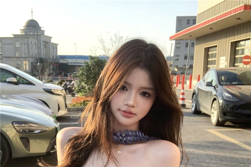 Plaid Frill Tube Bustier Top / Mid Rise Plain Wide Leg Suit Pants