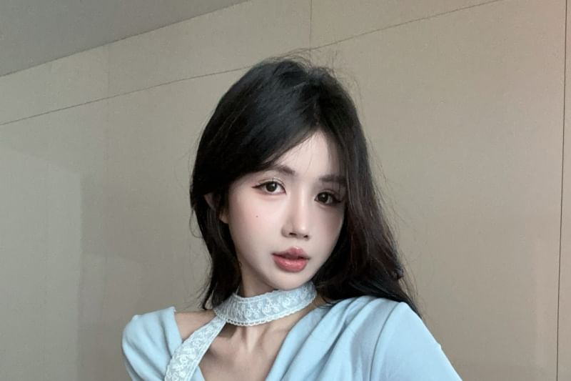 Short-Sleeve Cowl Neck Plain Asymmetrical Slim Fit Tee