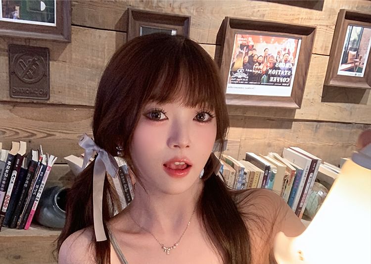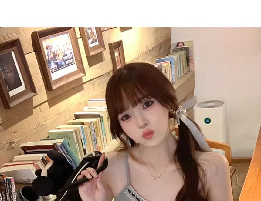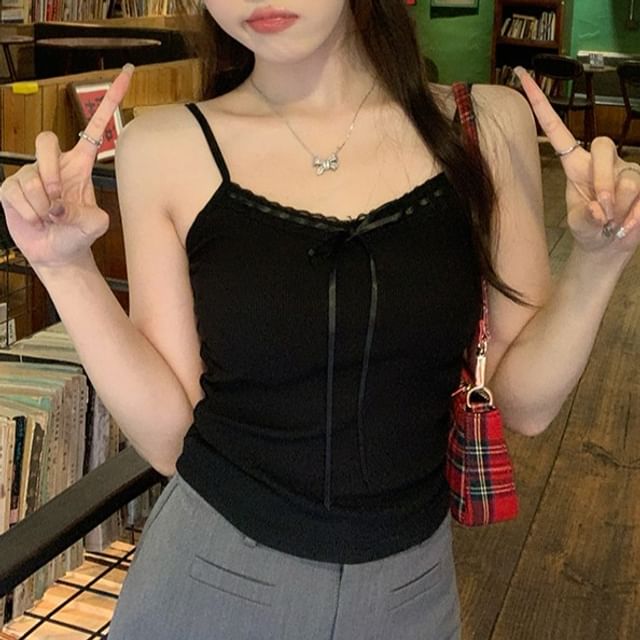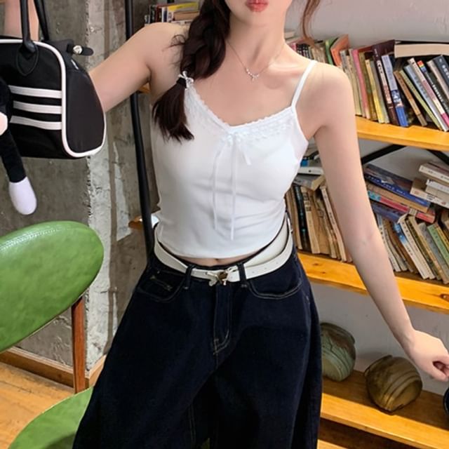 Plain Crop V-Neck Accent Top Trim Bow Cami Lace