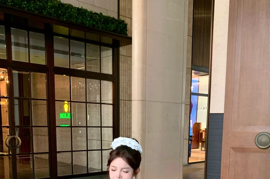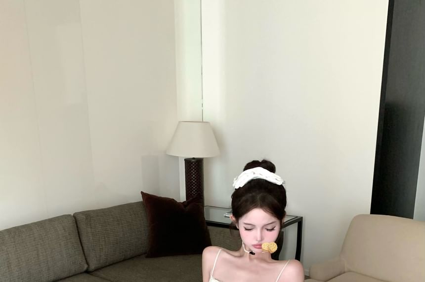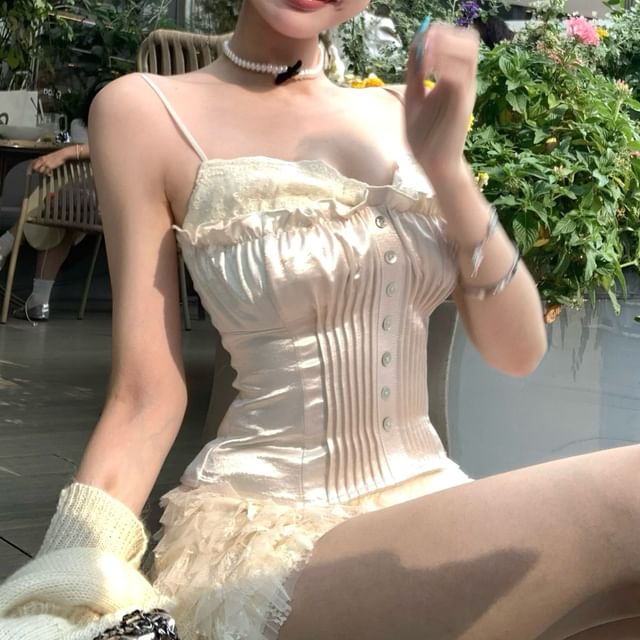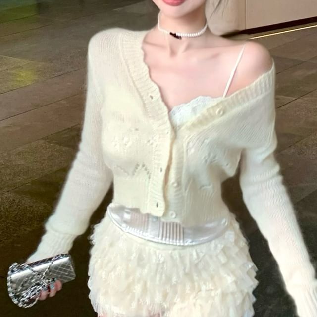 Plain Button Lace Panel Satin Camisole Top / V-Neck Plain Pointelle Cardigan / High Waist Tiered Mesh Shorts