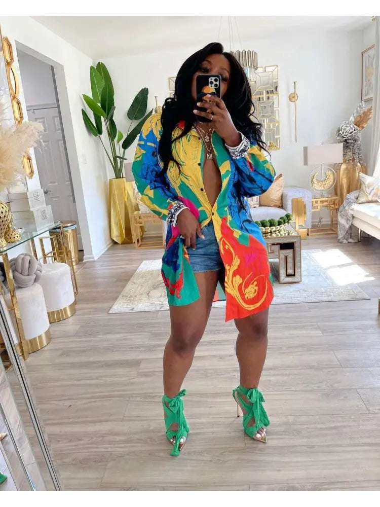 Printed Long Sleeve Short Shirt Dress