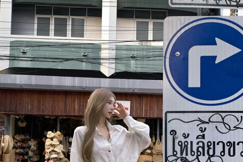 Puff-Sleeve Floral Embroidered Button-Up Tie-Side Mini A-Line Dress