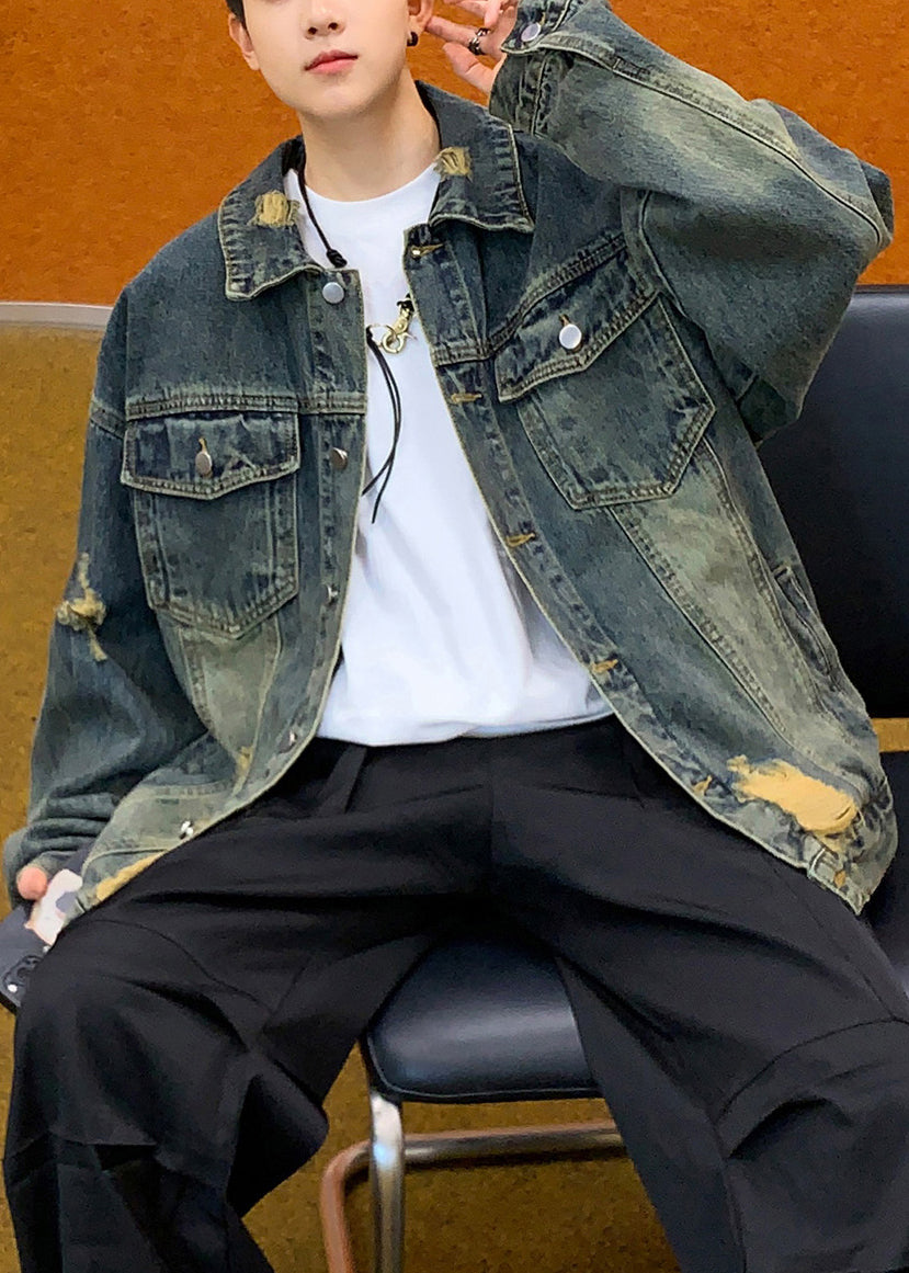 Retro Denim Blue Hole Button Pockets Denim Mens Coats Spring TC036