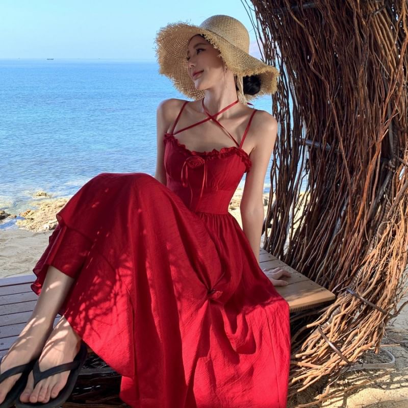 Ruffle Detail Spaghetti Flower Sundress Maxi Strap Plain