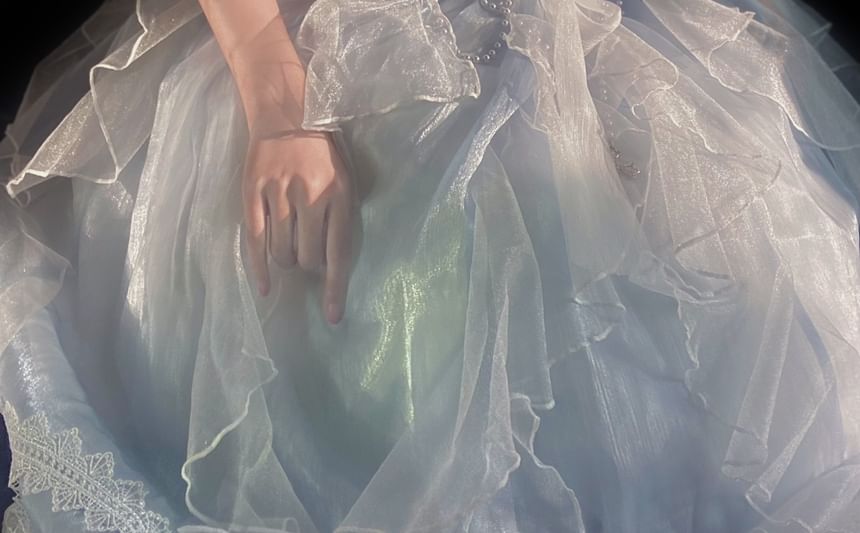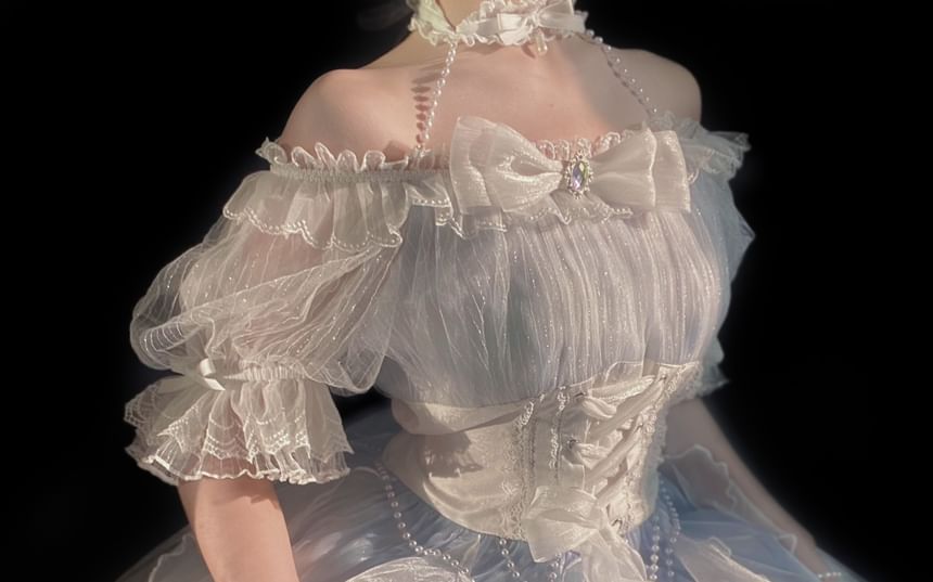 Lolita Short-Sleeve Cold Shoulder Plain Sheer Midi Dress + Waist Belt + Choker