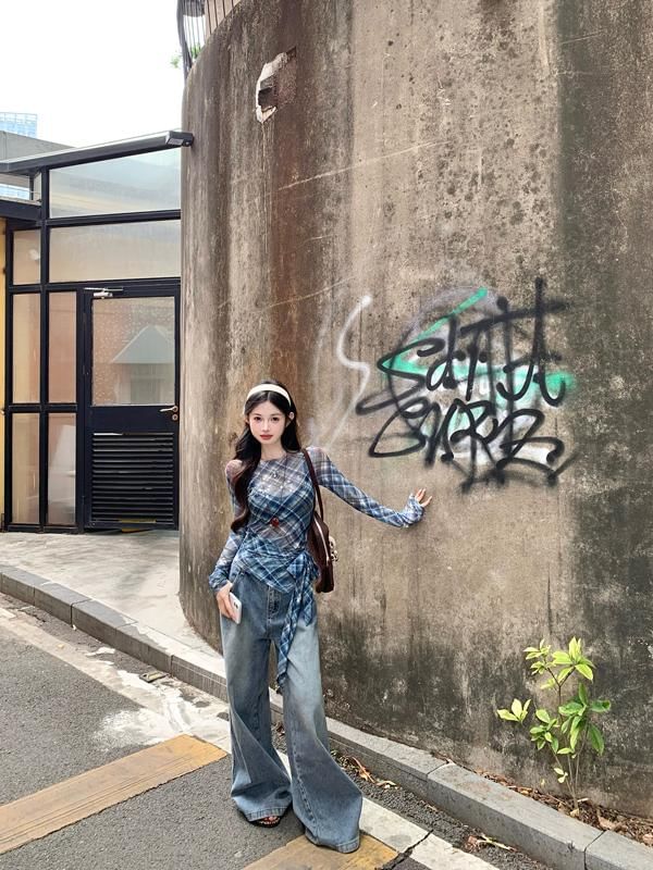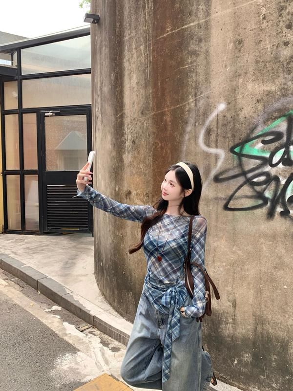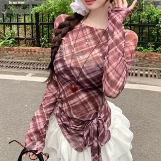 Long-Sleeve Boat Neck Plaid Asymmetrical Sheer T-Shirt