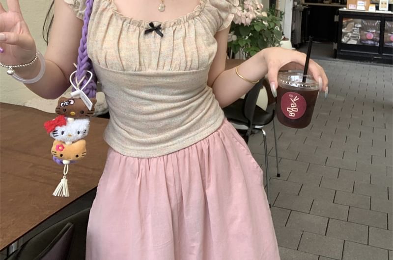 Short-Sleeve Bow Slim Trim Neck Ruffle Square Fit T-Shirt