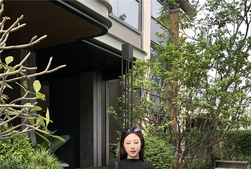 Short-Sleeve Slim Mid / Tee Maxi Skirt Fit Crop Mock Plain Neck A-Line Waist