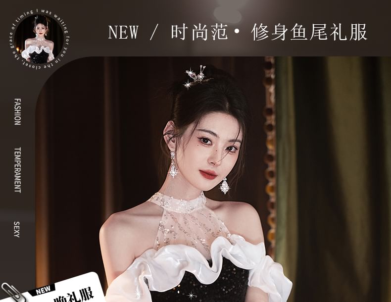 Short-Sleeve Cold Shoulder Sequin Mermaid Evening Gown
