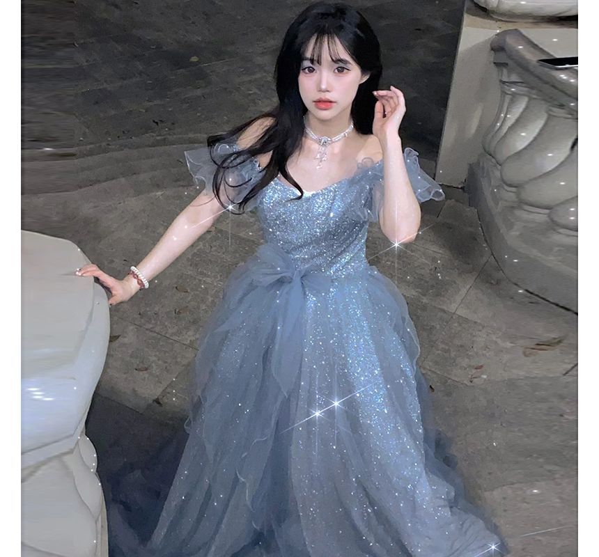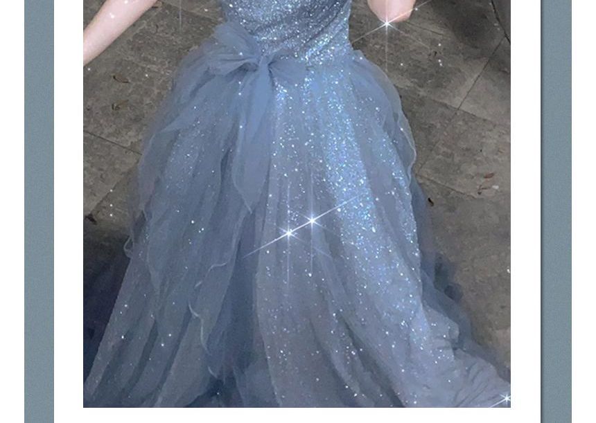 Short-Sleeve Off Shoulder Glitter Panel Mesh A-Line Evening Gown