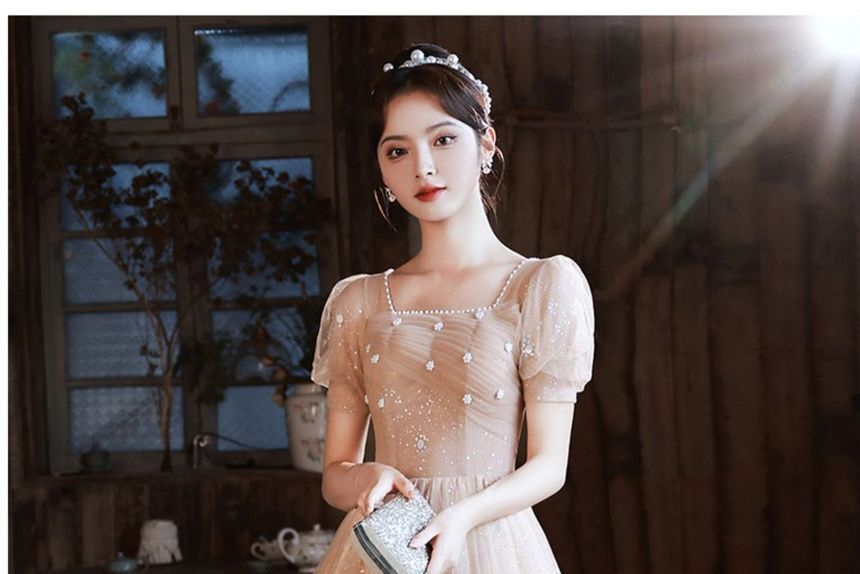 Short-Sleeve Square Neck Glitter Faux Pearl Trim Ruched Mesh A-Line Evening Gown