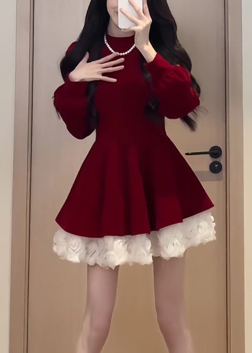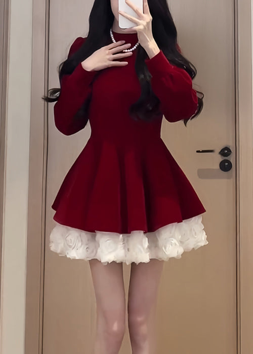 Simple Black O Neck Solid Patchwork Silk Velvet Mid Dress Spring