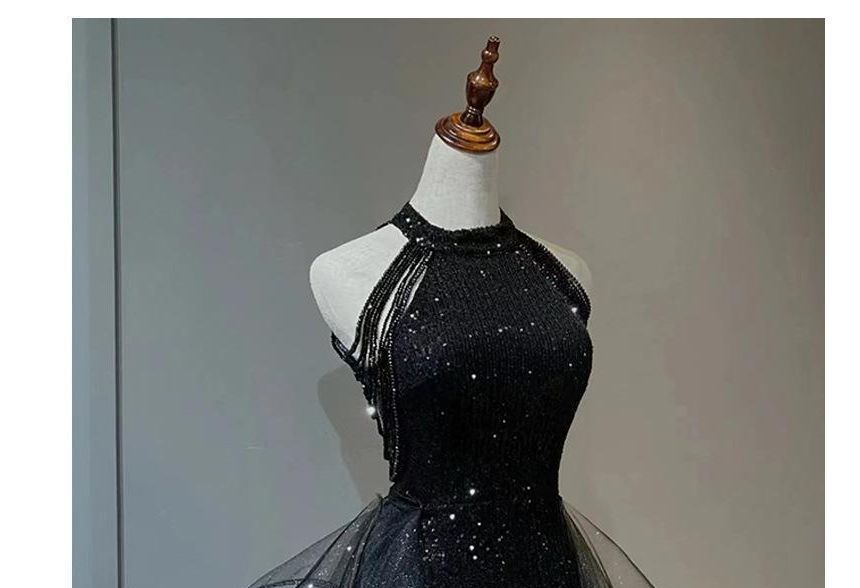 Sleeveless Crew Neck Plain Glitter Beaded Ruffle Panel Mesh A-Line Evening Gown