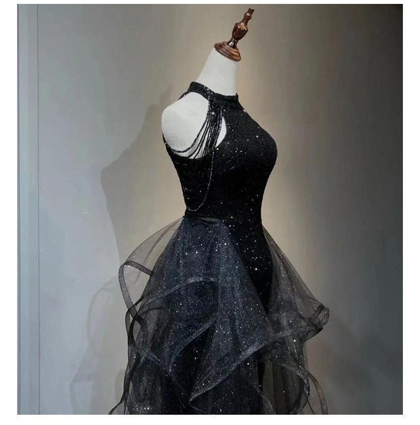 Sleeveless Evening Crew A-Line Glitter Beaded Neck Gown Panel Ruffle Mesh Plain