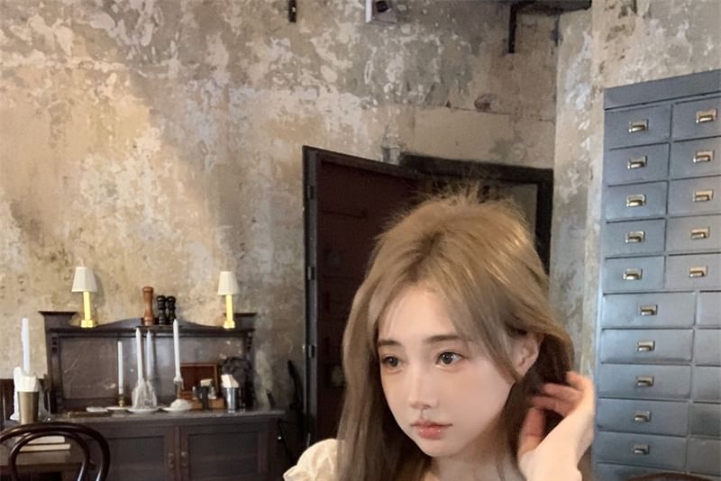 Short-Sleeve Lace Panel Slim Fit Blouse / High Waist Mini A-Line Skirt