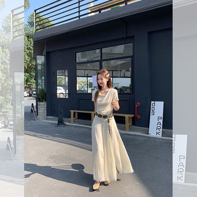 Short-Sleeve Cowl Neck Plain Ruched Slim Fit T-Shirt