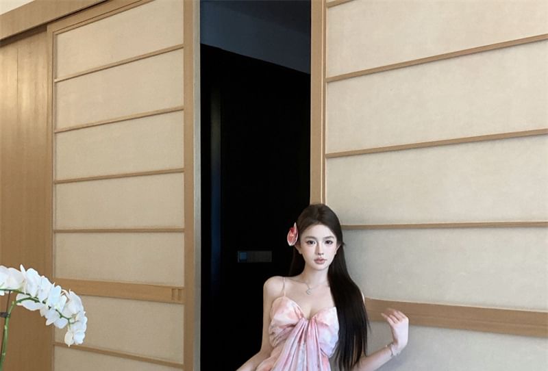 Strap Print Dress Ruched Maxi A-Line Spaghetti Floral V-Neck