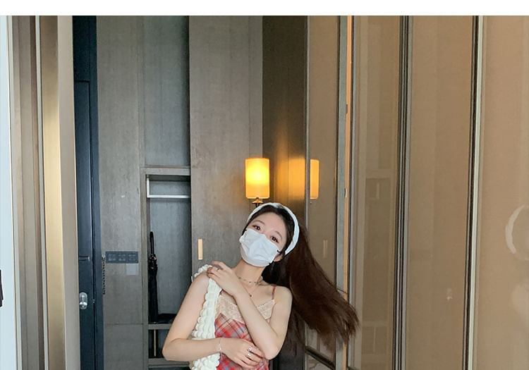 Strap Spaghetti Trim Plaid Dress A-Line Midi Lace