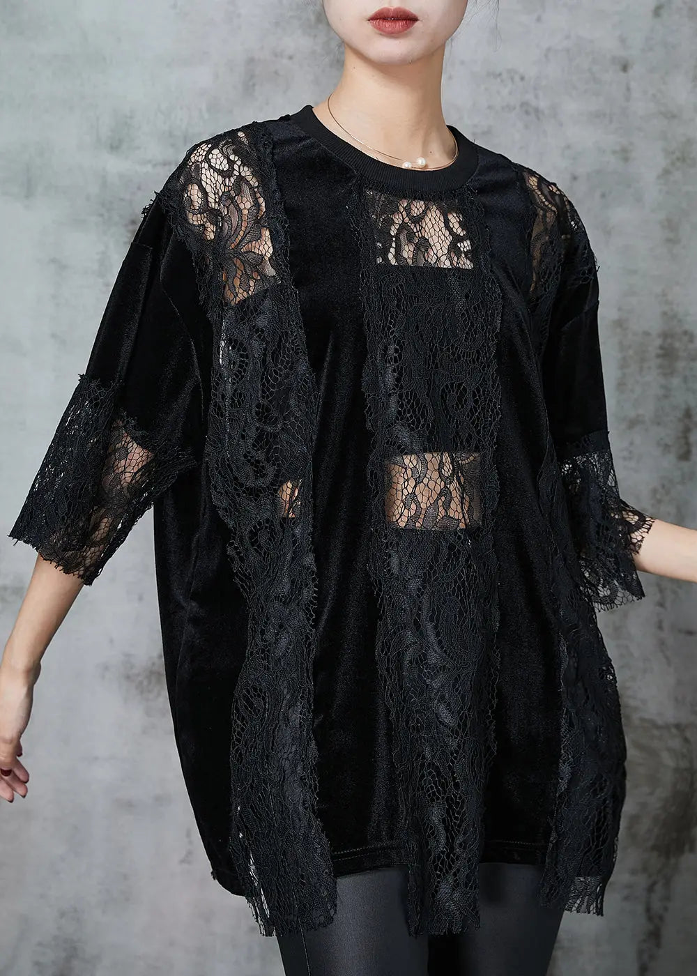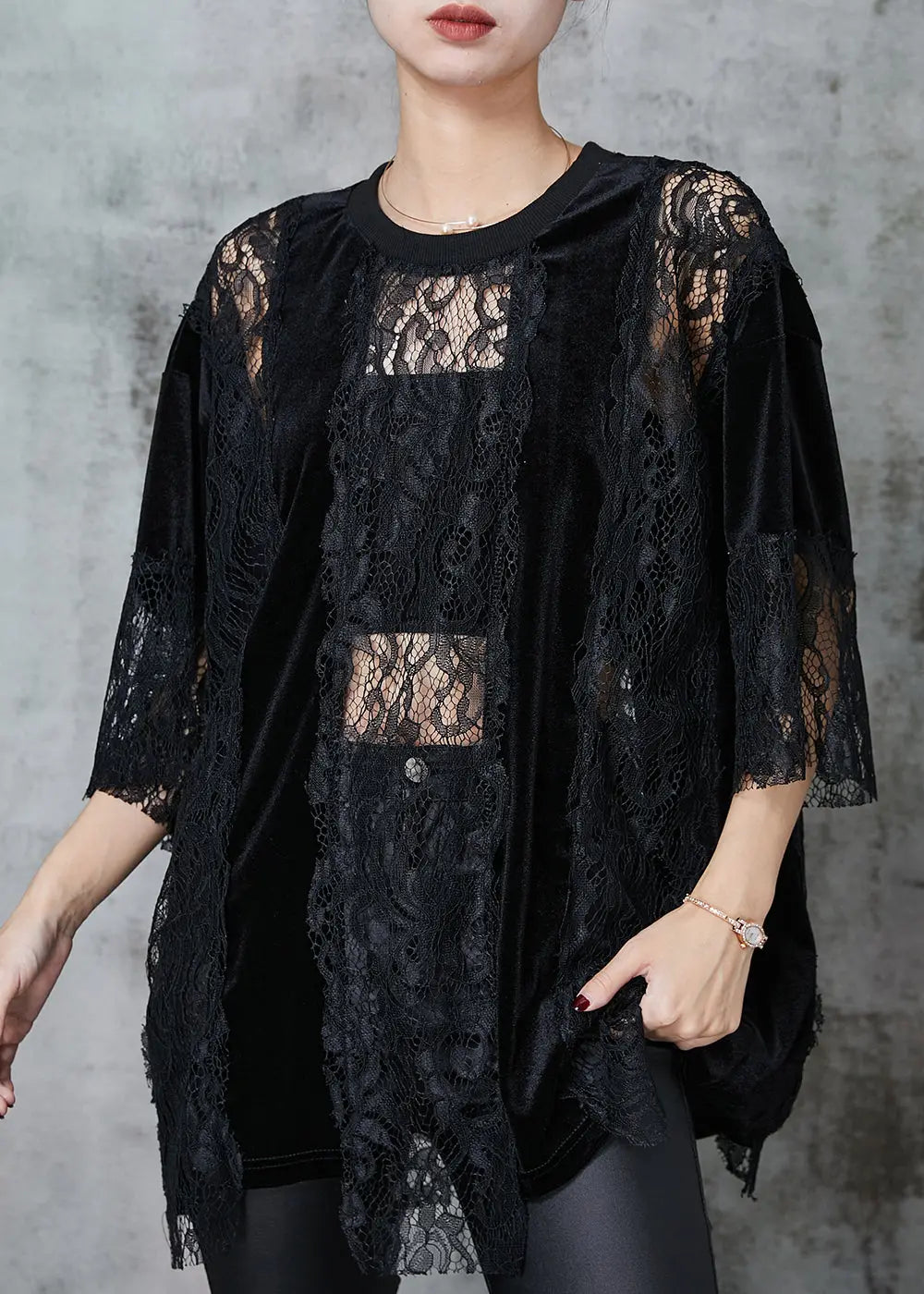 Style Black Hollow Out Patchwork Lace Shirts SummerFabric: Lace