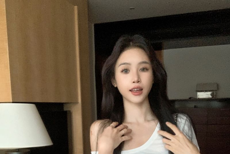 Short-Sleeve Off Shoulder Plain Crop T-Shirt / High Waist Plain Skirt Overlay Yoga Pants