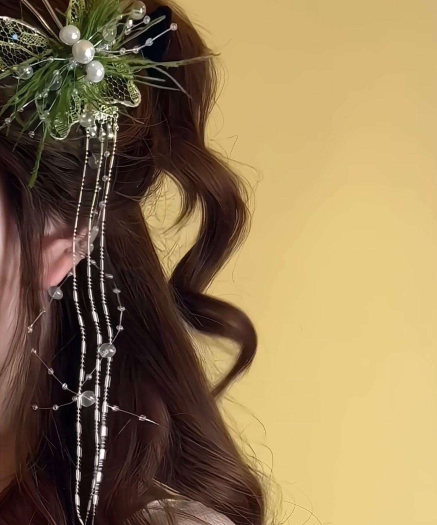 Beautiful Green Lace Feather Butterfly Pearl Tassel Hairpin