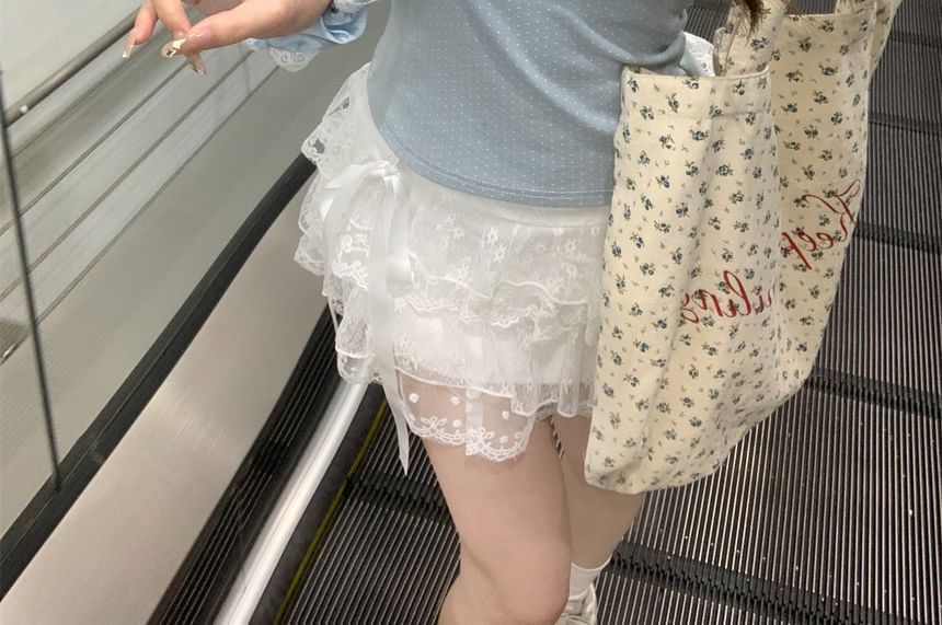 Tee Bear Fit Lace Crop Neck Slim Scoop Short-Sleeve Trim Print