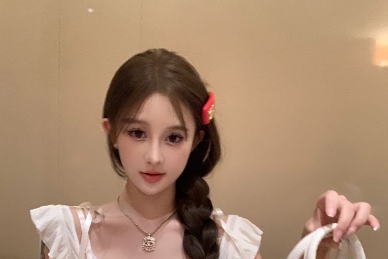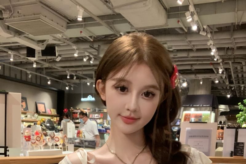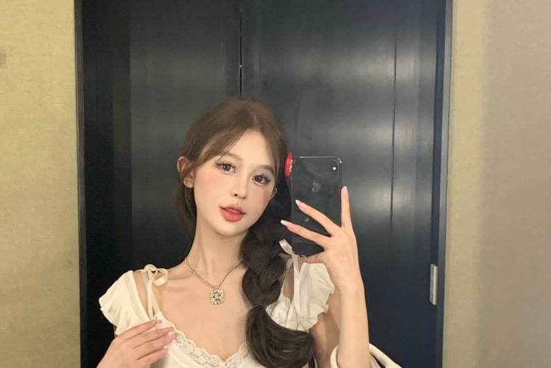 Tee / Cap-Sleeve Plain Cropped Neck Lace Trim Top V-Neck Scoop Cami Ruffle