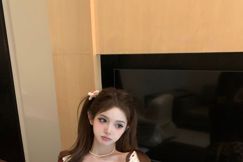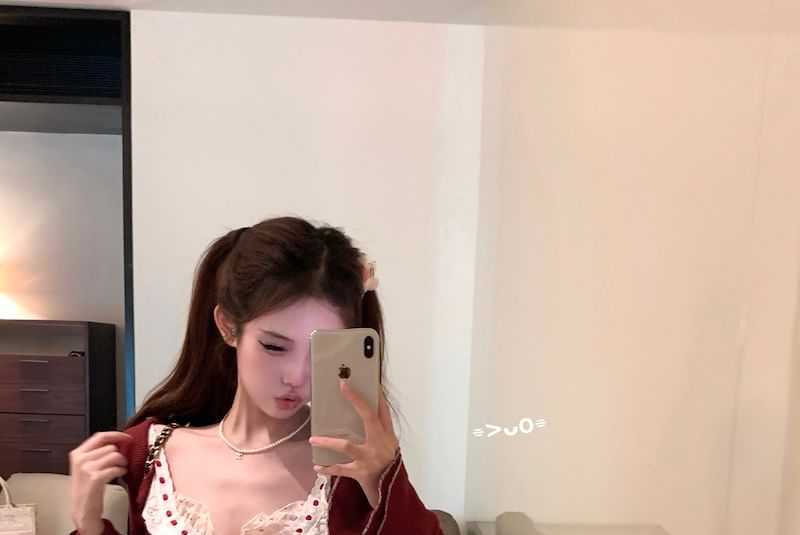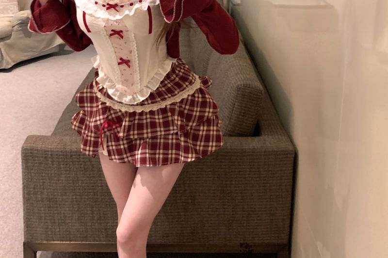 Top Panel A-Line Cardigan / Print Plaid Skirt Floral Striped Ruffle High Bow Sleeveless Waist Mini