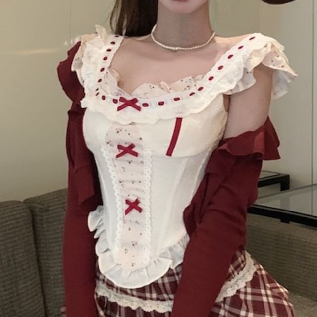 Sleeveless Floral Print Bow Ruffle Panel Top / High Waist Plaid Mini A-Line Skirt / Striped Cardigan