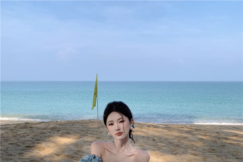 Trim Floral Dress Maxi Puff-Sleeve Ruffle A-Line Print Slit Off-Shoulder