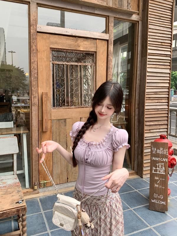 Short-Sleeve Square Neck Plain Bow Lace Trim Slim Fit Tee
