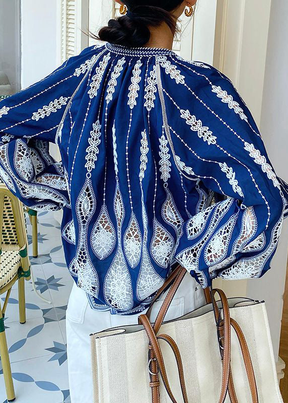 Up Spring Blouses Out Cotton Hollow Loose Lace Blue